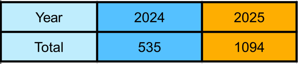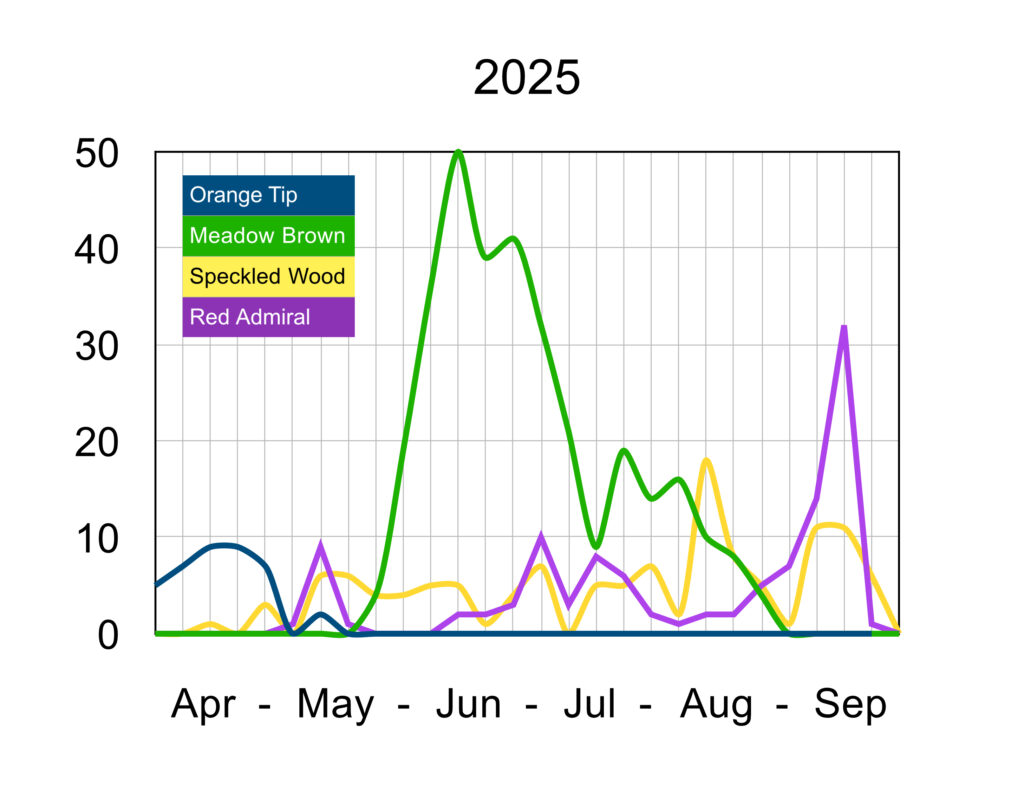 It is thought that although there were fewer opportunities for breeding and egg laying during the cool, wet and dull conditions of 2024, the more favourable weather in 2025 resulted in better survival rates even if the numbers of eggs/larvae were low.