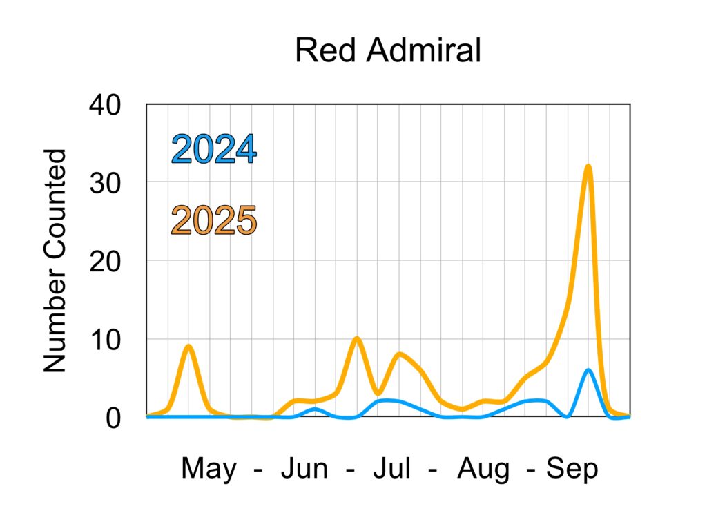 One of our most common summer butterflies. They rest during winter in their caterpillar stage. The reason for showing this graph is to point out that in 2025 the adults emerged in great numbers many weeks before they did in 2024. The early, warm and dry weather is the most likely reason. Their numbers, along with many other butterflies, were much higher in 2025